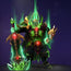 The Grim Destiny set transforms Ostarion into a formidable vision of eerie green and ebon grandeur, sharply accented by burnished gold. His entire silhouette radiates power, from the imposing, spiked crown and jagged armor plating to the magnificent, tattered cape. Its outer layer a cascade of textured green marked with dark sigils, flowing over a rich crimson underside. The centerpiece, a fearsome and ornately designed sword, crackles with vibrant glowing green energy and a sinister crimson gem. Pervasive spectral energy and ethereal particle effects envelop the King, ensuring every last hit and devastating Wraithfire Blast feels immensely more impactful and visually striking.